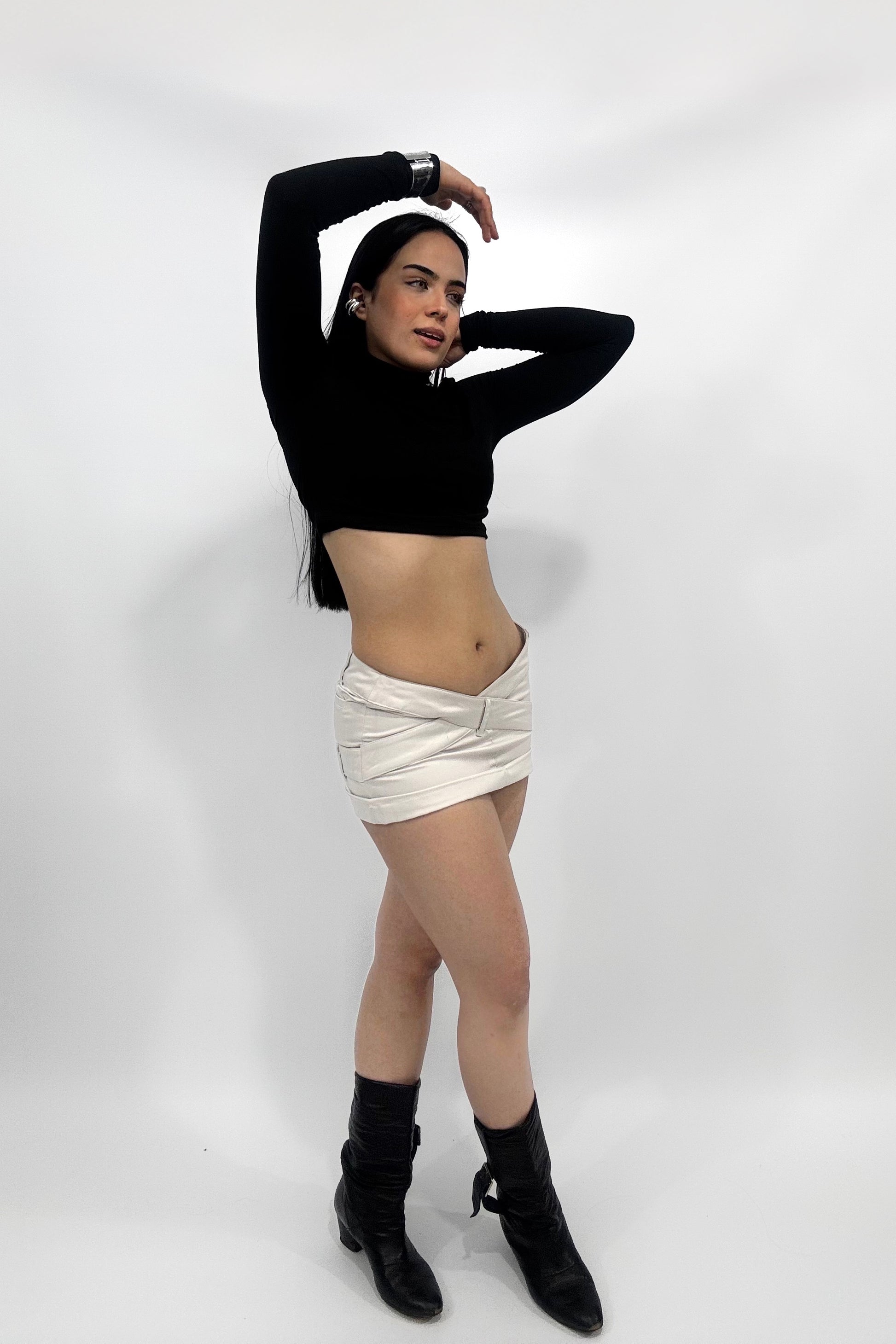 Mini sastrera, tiro medio con cintura cruzada en delantero y doble en trasero con bolsillos ribete. Cierre invisible en espalda para facilitar el acceso a la prenda.