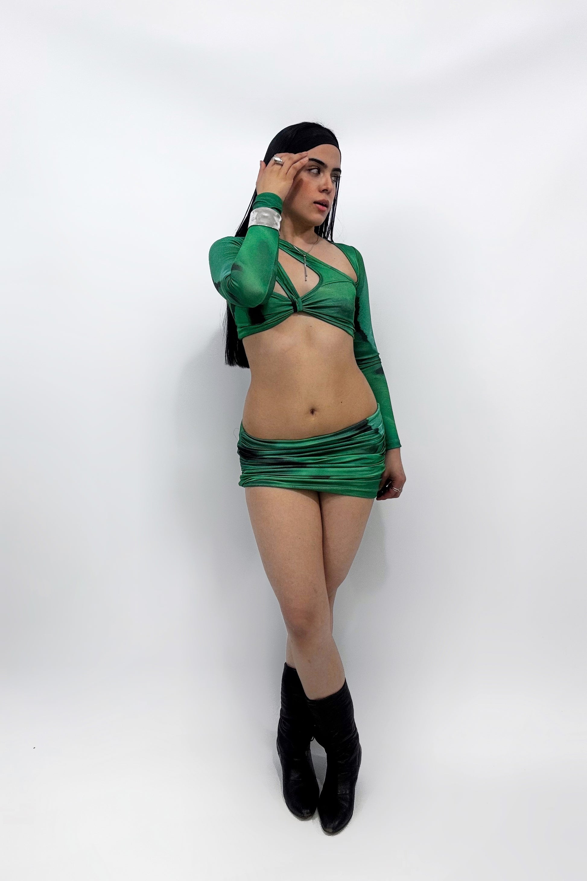 Conjunto de dos piezas en tela piel de durazno con efecto batik en tonos verde esmeralda y negro. Incluye un top con mangas largas y aberturas laterales que realzan el busto, y una mini falda fruncida con ajuste al cuerpo. Su textura suave y elástica lo hace cómodo y llamativo, ideal para noches especiales o eventos con estilo alternativo y audaz.