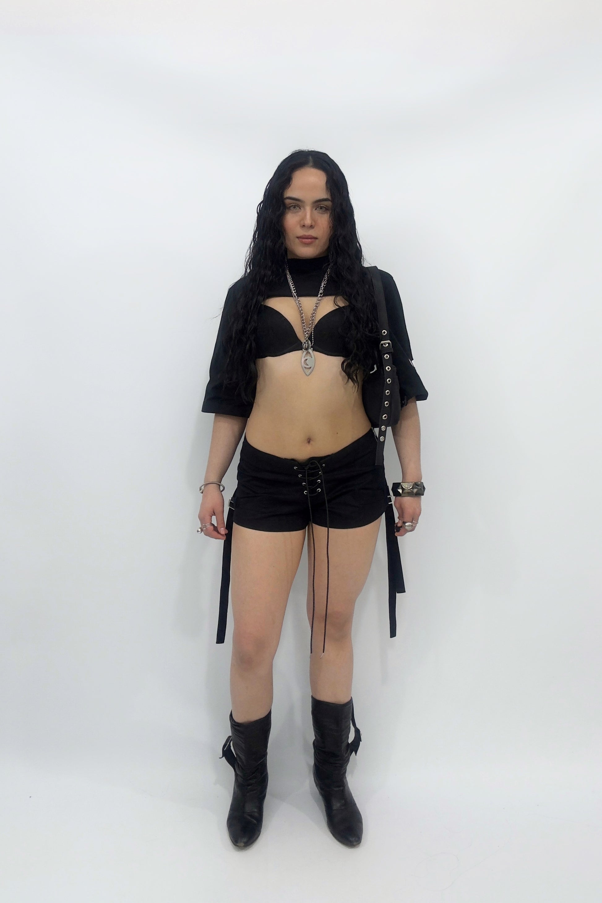 Microshort de gabardina elastizada. Cruce de cordon con ojalillos metálicos en centro delantero. Para facilitar acceso a la prenda, cierre invisible en lateral de la prenda. Tiras colgantes con hebilla zamak. Recortes en la prenda.
