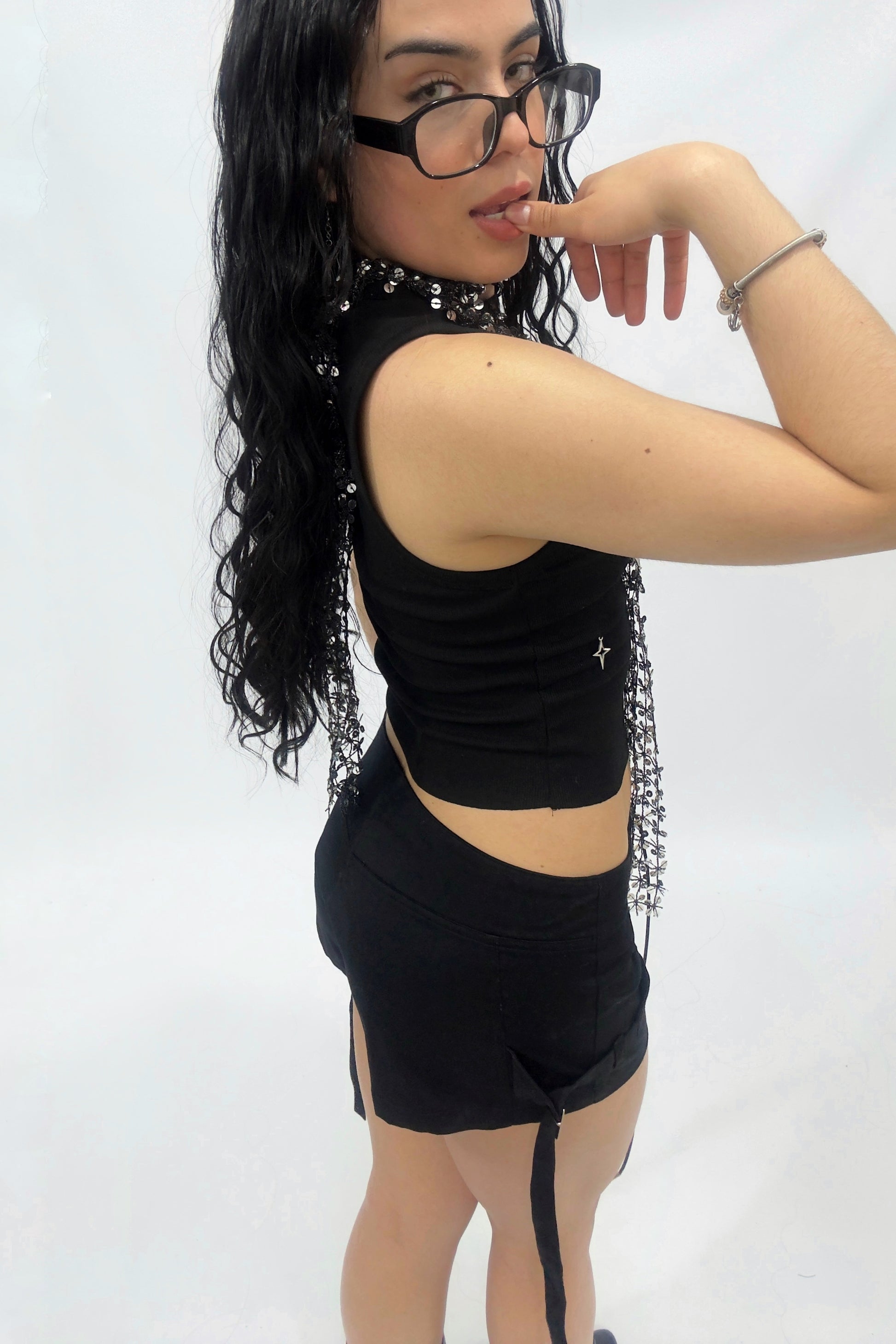 Este top ajustado es todo lo que necesitás si querés destacar con un estilo rebelde y poderoso. Decorado con dijes metálicos colgantes (cruces, estrellas, corazones y más), cada pieza lo convierte en una declaración visual.